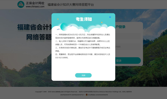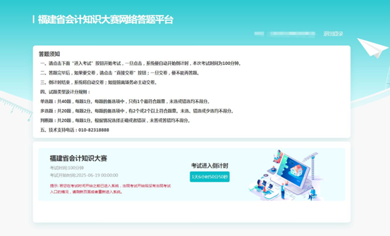 网络答题通道将于6月19日正式开放,持续至6月25日关闭,为期一周。符合参赛条件的财会人员,可在规定时间内登录答题系统(仅限电脑登录)//learnexam.chinaacc.com/fjjs,注册后报名参赛。每人共有3次答题机会,取最高分作为最终成绩,成绩90分以上的参赛人员,可凭成绩单抵顶一个年度的会计人员继续教育。